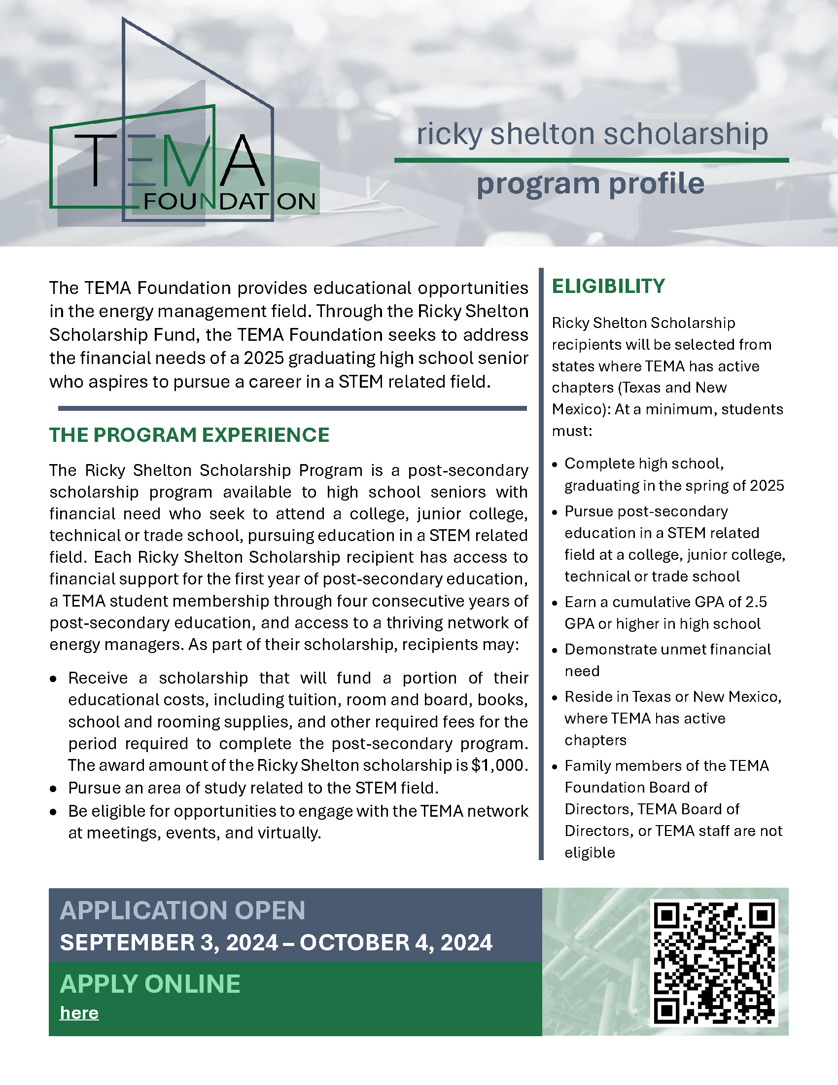 The Ricky Shelton Scholarship Program is a post-secondary scholarship program available to high school seniors with financial need who seek to attend a college, junior college, technical or trade school, pursuing education in a STEM related field. Each Ricky Shelton Scholarship recipient has access to financial support for the first year of pos-secondary education, a TEMA student membership through four consecutive years of post-secondary education, and access to a thriving network of energy managers. As part of their scholarship, recipients may: